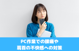 腰への負担を軽減するためにクッションを使用したり、PCの画面を目線より上に配置し、下を向かないように心がけていますが、それでも効果がありません。